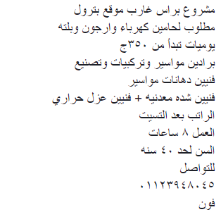 مطلوب لحامين بمشروع براس غارب لحامين كهرباء وارجون وبلته يوميات تبدا من 350 برادين مواسير وتركيبات وتصنيع فنين دهانات مواسير فنين شده معدنيه +فنين عزل حرارى لعمل تيست 01153311109